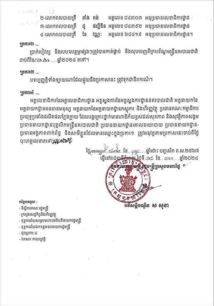ក្រសួង មហាផ្ទៃ បណ្ដេញ មន្ត្រី នគរបាល ៤ រូប ចេញ ពី ក្របខណ្ឌ នគរបាល ជាតិ ដោយសារ ពួកគេ ប្រព្រឹត្ត ល្មើស វិន័យ នគរបាល ជាតិ ។