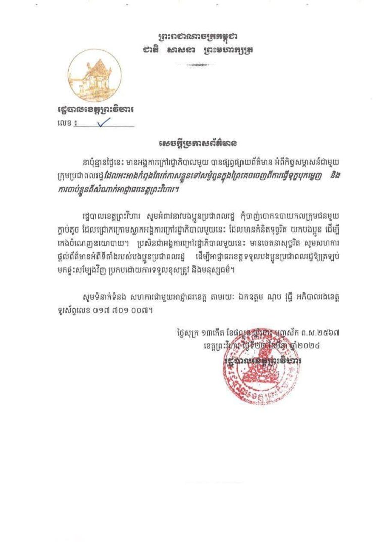 បន្ទាប់ពីទទួលបានព័ត៌មានពាក់ព័ន្ធជម្លោះដីធ្លីខាងលើនេះ នៅរសៀលថ្ងៃព្រហស្បតិ៍ ទី៧ ខែមីនា ឆ្នាំ២០ ២៤ នេះ សម្តេចតេជោ ហ៊ុន សែន បានបញ្ជាជំនួយការ ពីរ រូប គឺ ឯកឧត្តម គង់ លីវ៉ា និង ឯកឧត្តម កែវ ផុង ចុះទៅ កាន់ ខេត្តព្រះវិហារ ធ្វើការងារជាមួយឯកឧត្តម គីម រិទ្ធី អភិបាលខេត្តព្រះវិហារ ដើម្បីស្រាវជ្រាវលំអិតទៅលើ បញ្ហាខាងលើនេះ។