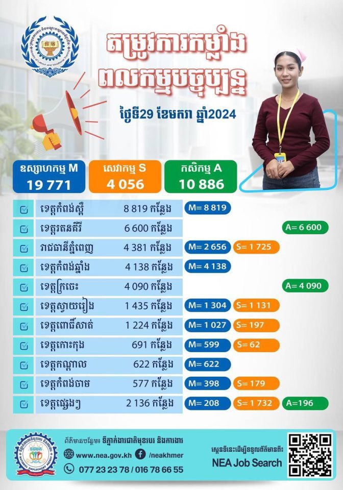 🔔សម្រាប់បងប្អូនប្រជាពលរដ្ឋដែលចង់ស្វែងរកការងារ សូមទាក់ទងមកទីភ្នាក់ងារជាតិមុខរបរ និងការងារ (NEA) នៃក្រសួងការងារ និងបណ្តុះបណ្តាលវិជ្ជាជីវៈ តាមលេខទូរស័ព្ទ 077 23 23 78 ឬ 016 78 66 55 (Telegram)។