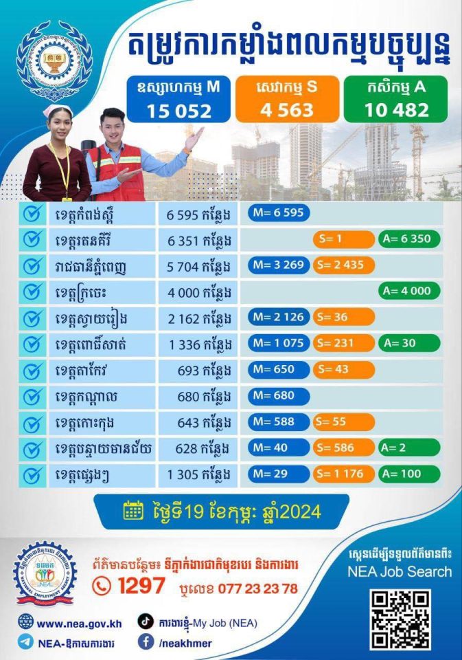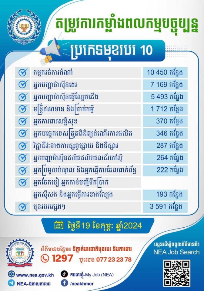 សម្រាប់បងប្អូនប្រជាពលរដ្ឋដែលចង់ស្វែងរកការងារ សូមទាក់ទងមកទីភ្នាក់ងារជាតិមុខរបរ និងការងារ (NEA) នៃក្រសួងការងារ និងបណ្តុះបណ្តាលវិជ្ជាជីវៈ តាមលេខទូរស័ព្ទ 1297 ឬ 077 23 23 78 (Telegram)
