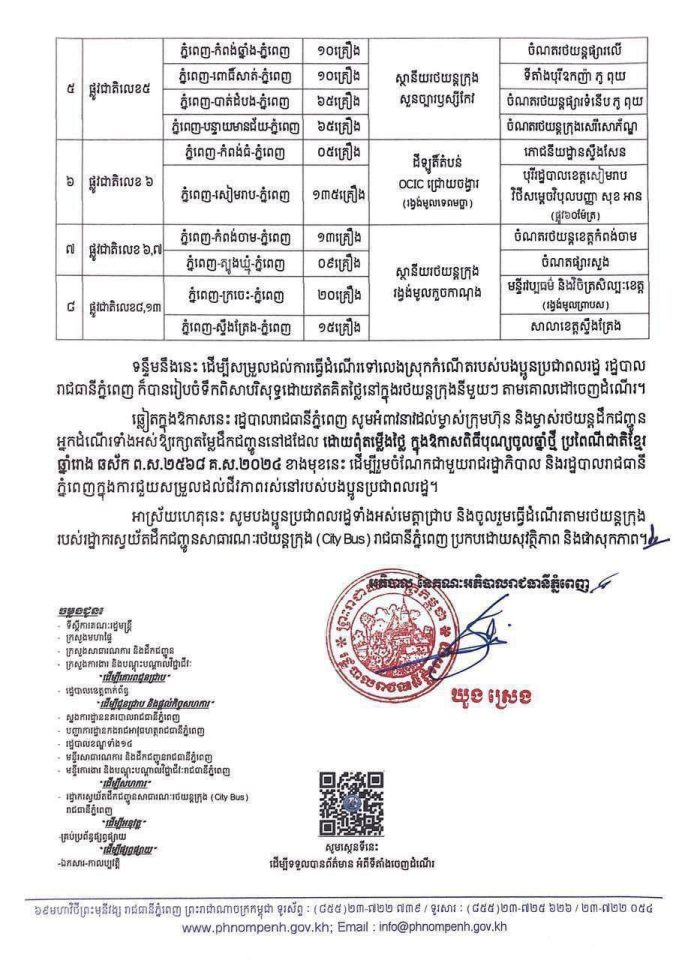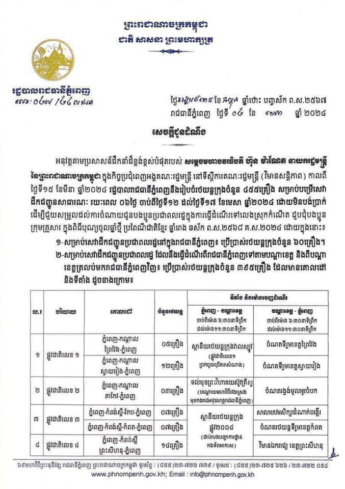 យោងតាម ប្រតិទិន និងសេចក្តីប្រកាសជូនដំណឹងរបស់ក្រសួងការងារនិងបណ្តុះបណ្តាល ក៏ដូចជាសេចក្តីជូនដំណឹងរបស់សាលារាជធានីភ្នំពេញ ក៏បានប្រកាសអំពីការឈប់សម្រាក០៤ ថ្ងៃ ចាប់ថ្ងៃទី១៣ ខែមេសា ដល់ថ្ងៃទី១៦ ខែមេសា ឆ្នាំ២០២៤ សម្រាប់សង្ក្រាន្តឆ្នាំថ្មីដល់កម្មករនិយោជិត និងមន្ត្រីរាជការ ក្នុងនោះសាលារាជធានីភ្នំពេញក៏បានផ្តល់ រថយន្ត ក្រុងដឹកអ្នកដំណេីរចំនួន៤៥៥ គ្រឿង សម្រាប់ដឹកជញ្ជូនបងប្អូនកម្មករនិយោជិត និងប្រជាពលរដ្ឋទៅស្រុកកំណេីត ទាំងទៅនិងមក ដោយមិនអស់កម្រៃ ក្នុងរយះពេល០៦ ថ្ងៃ គិតចាប់ថ្ងៃទី១២ ដល់ថ្ងៃទី១៧ ខែមេសា ឆ្នាំ២០២៤ ។