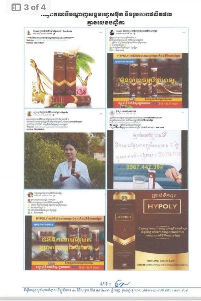(ភ្នំពេញ): ក្រសួងសុខាភិបាលចេញលិខិតជូនដំណឹងព្រមានចាត់វិធានការក្ដៅលើអ្នកចែកចាយផលិតផលព្យាបាលជំងឺទឹកនោមផ្អែម ឈ្មោះ HYPOLY ដោយគ្មានលេខបញ្ជិកា រួមទាំងជនពាក់ព័ន្ធដទៃទៀតត្រូវបញ្ឈប់ការផ្សព្វផ្សាយ នាំចូល ចែកចាយ ឬលក់ផលិតផលខាងលើនេះជាបន្ទាន់ ពីព្រោះផលិតផលនេះមិនអាចធានាបាននូវគុណភាព សុវត្ថិភាព និងប្រសិទ្ធភាពបានឡេីយ ហេីយអាចជាផលិតផលក្លែងក្លាយបណ្តាលឲ្យខាតបង់ប្រាក់កាស និងមានគ្រោះថ្នាក់ដល់អាយុជីវិតរបស់អ្នកប្រេីប្រាស់ទៀតផង នេះបេីយោងតាមសេចក្តីជូនដំណឹងរបស់ក្រសួងចុះថ្ងៃទី២ ខែមេសា ឆ្នាំ២០២៤ 🇰🇭៕